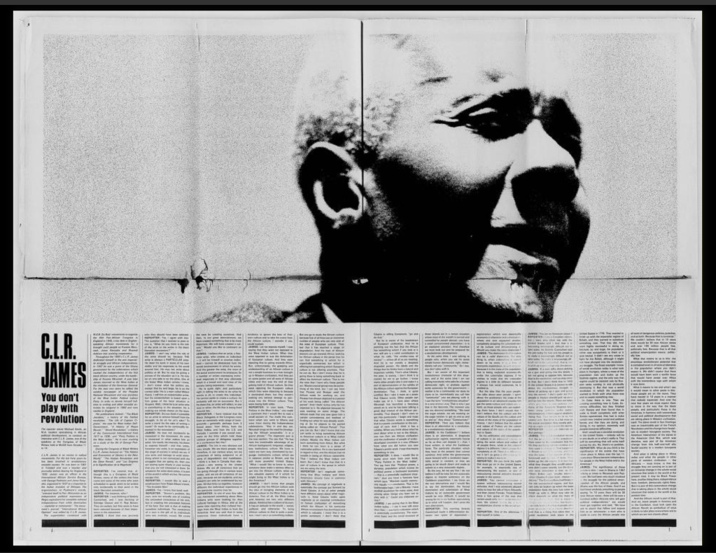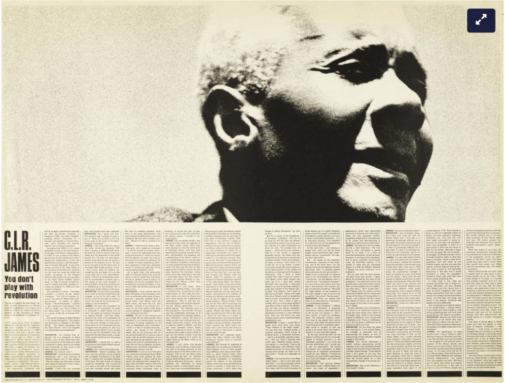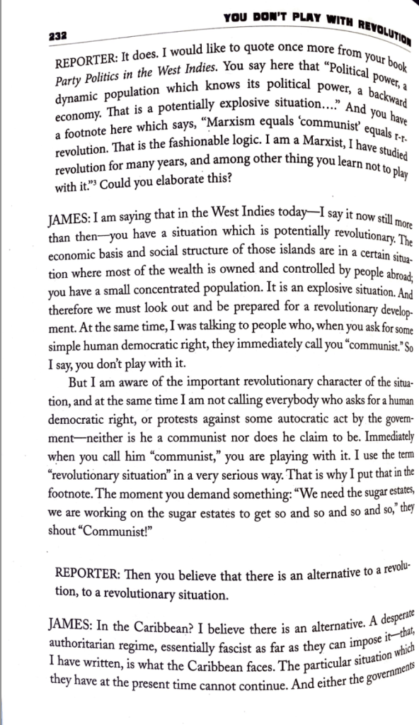 The phrase “you don’t play with revolution” is a near quote from James, as Smith’s interview notes, from his book Party Politics in the West Indies (1962). In 2009, AK Press printed a book entitled You Don’t Play With Revolution: The Montreal Lectures of C.L.R. James edited by David Smith. The book includes Smith’s interview as a chapter. Below we pull out the section of the interview where James clarifies what he means when he says not to play with revolution: