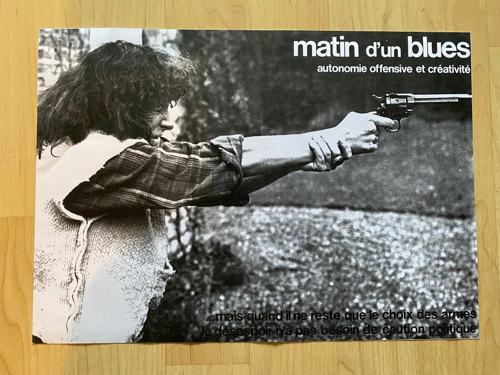 This striking poster uses the image on the cover of issue #2, though we have been unable to figure out if the poster was used to advertise for the specific issue or for the publication more generally. (We purchased our copy from someone who ran a bookshop in Paris in the 1970s, but did not recall any background of the poster). The smaller text along the top reads “autonomie offensive et creativitie” (roughly ‘offensive autonomy and creativity’) followed by “mais quand il ne reste que le choix des armes le desespoir n’a pas besoin de caution politique” along the bottom (roughly, ‘but when only the choice of weapons remains, despair does not need a political guarantee’).