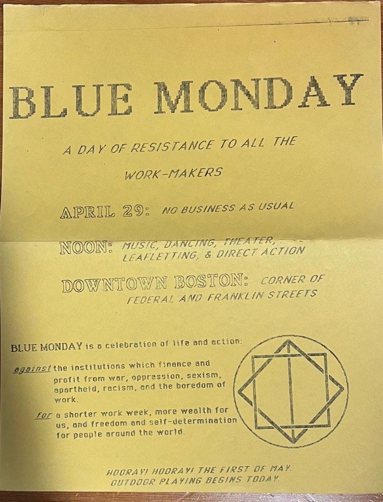 Our copy of the pamphlet came with a neat flier for “Blue Monday: A Day of Resistance to all the Work-Makers.” The anti-work sentiment is transparent. We cannot locate any additional details of the event or source the symbol on the bottom right (if you have any hints please reach out to us).