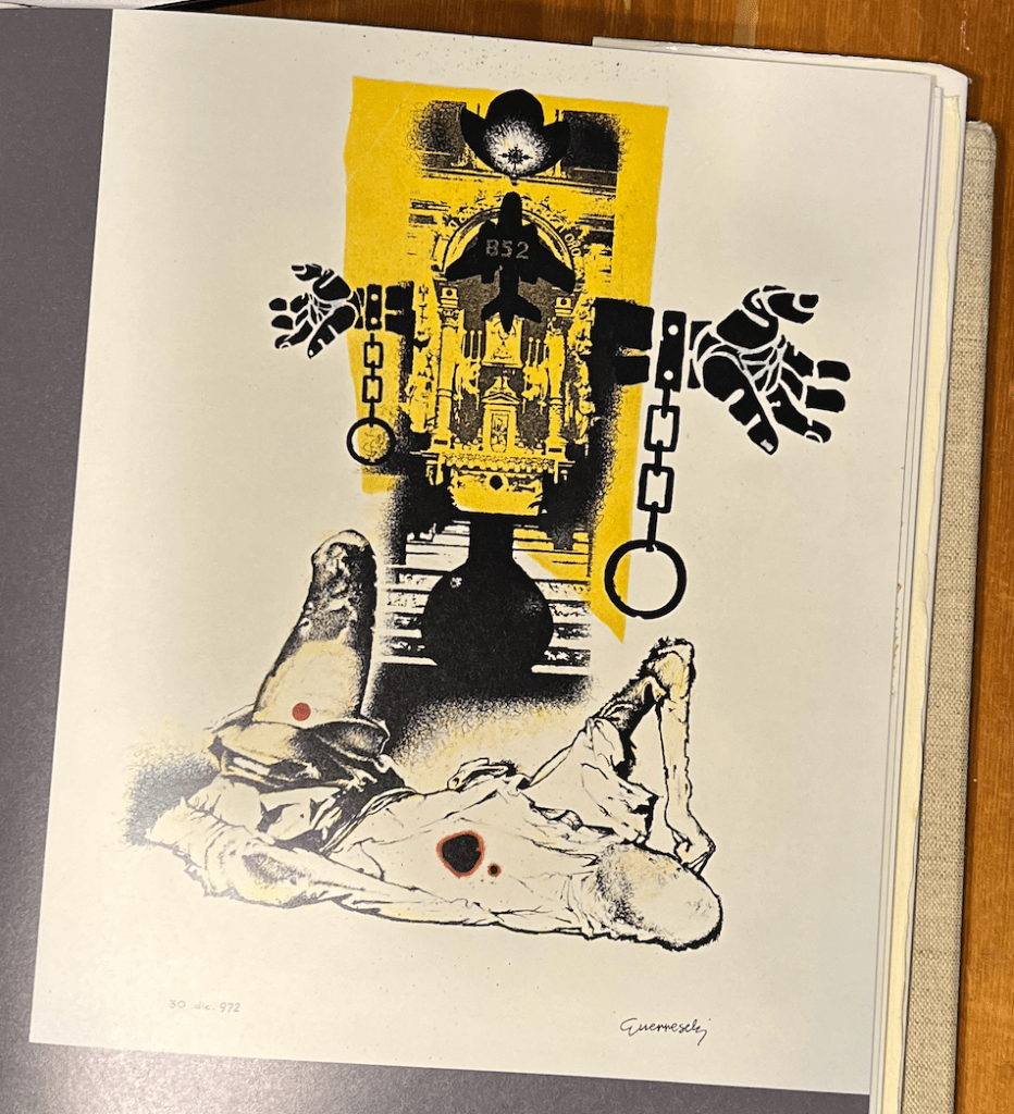 Vietnam Suite, as a collection of etchings by Giuseppe that portray often brutal images related to the Vietnam War, was published twice, but with different texts. The first publication was a catalogue for the 1973 exhibit at the Fanto de Spade gallery in Milan, which did not contain Montaldi’s adjoining text. This second version was published the following year, in 1974, by Fratelli Pozo in Turin. Montaldi’s essay is entitled “Sul Vietnam, Problemi, Date E Immagini” (“About Vietnam, Issues, Dates And Images. To Nikolaus, Diego, Max.”)