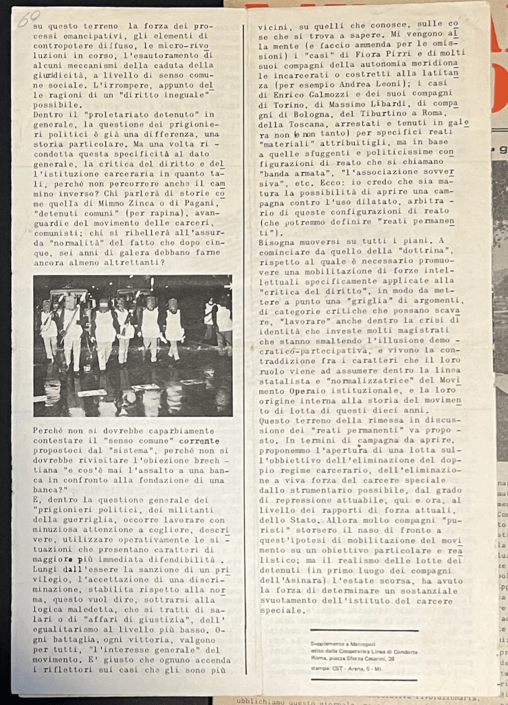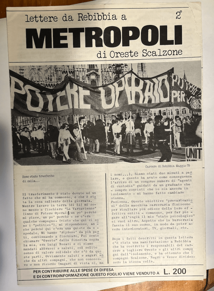 Oreste Scalzone, a leading militant of Potere Operaio, and a founder of the important journalMetropoli, was one of those arrested (his arrest occurred two months before the publication of the first issue of the journal). This supplement to Metropoli was published before the printing of Metropoli’s first issue in June 1979. The second issue of the journal was published, nearly a year later, in April 1980.
