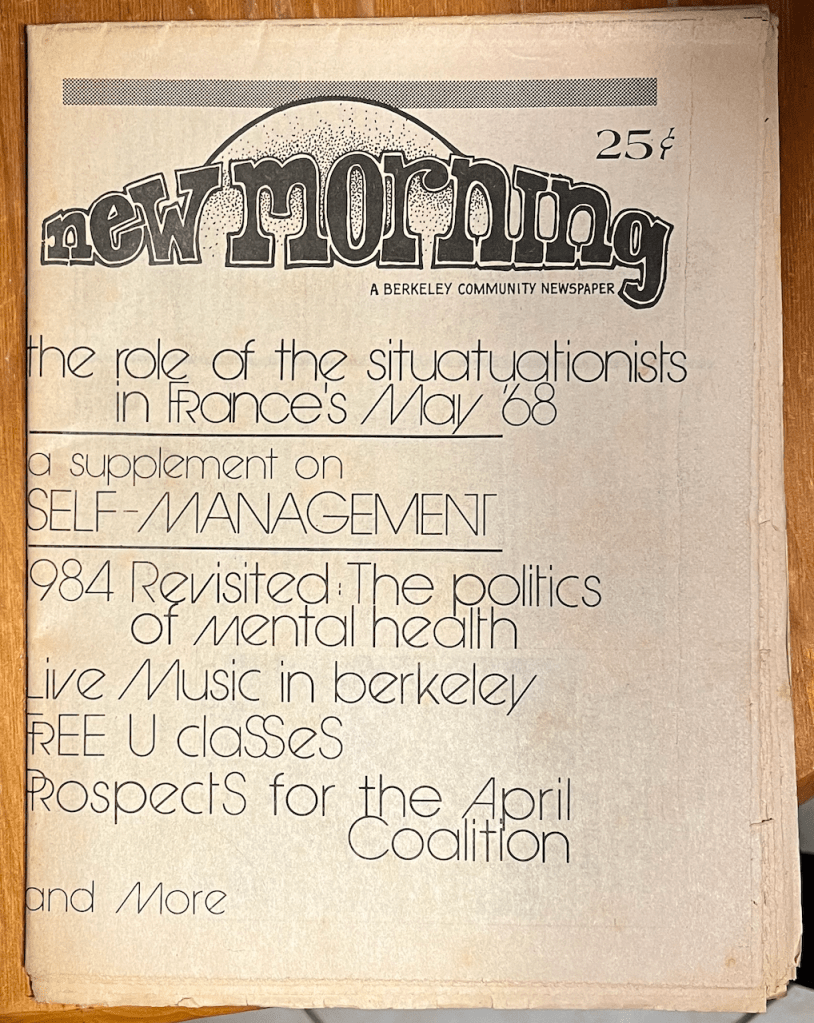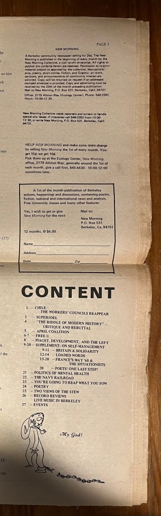 Tom Woodhull, part of the pro-situ group Negation (as mentioned in his interview with Chomsky, here), had some involvement with New Morning for at least a couple of issues, as he was also involved in the preceding month’s issue that included an article on council communism. This issue was likely that mentioned by Ken Knabb in his essay “Remarks on Contradiction and its Failure,” when he cites “an underground paper trying to fill up the current ideological void will put out a special issue on situationism which simply lumps together everyone who is able to babble a few slogans about the spectacle, sacrifice, Leninism, etc., and publishes a “Dictionary of Situationese” for the edification of those who aren’t yet even capable of that.”