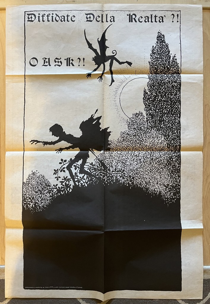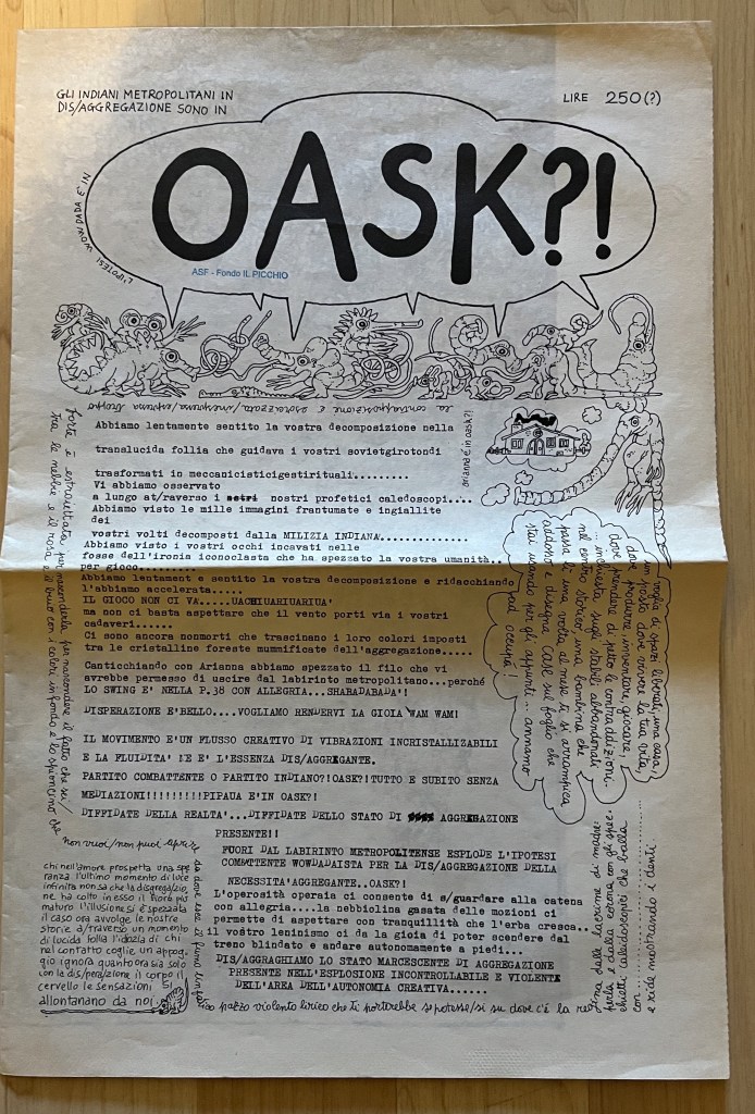 Oask?! (an anagram of “kaos”) was the first publication of the Metropolitan Indians. It was published as a supplement to issue 74 of Lotta Continua, and is primarily the work of famed Italian artist Pablo Echaurren. This was the only unique issue of Oask?! published, but Echaurren would use the nameplate in other collaborations (for example the publication of Abat/Jour). At the time, Echaurren worked full-time for Lotta Continua.