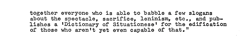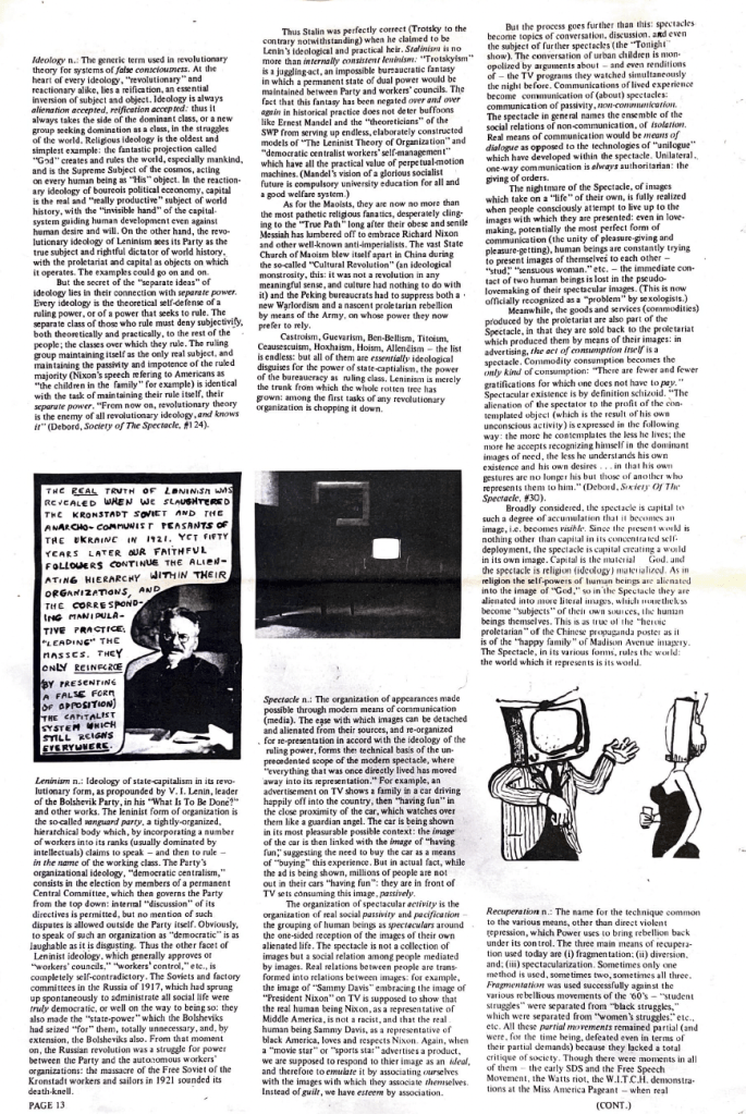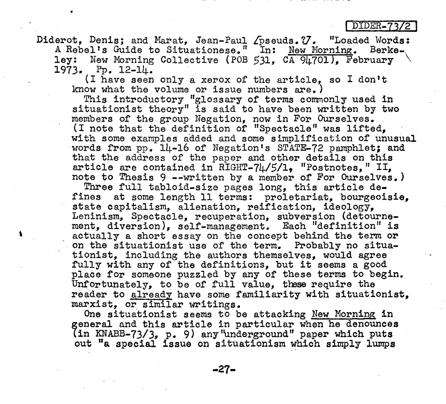 Yet, even given Knabb’s criticisms, “Loaded Words” is, in fact, a good, quick and dirty introductory guide to core situationist concepts. It seems reasonable to guess that Woodhull may have been one of the two pseudonymous authors. In 1975 the “Beni Memorial Library” in Ann Arbor published a very helpful book (available here) called A Bibliography of North American Situationist Texts, which included an entry on “Loaded Words”: