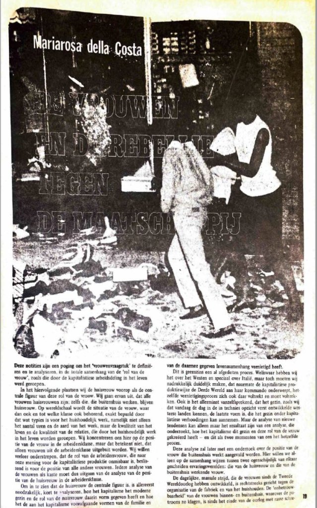 Dalla Costa’s article (in this printing written as ‘della Costa’) is a Dutch translation of her seminal essay ‘Women and the Subversion of the Community’, first published in Italian in 1971 and then in initial English translation in 1972. Dalla Costa wrote an extensive note on the genesis of the essay in the English collection of her writings published by PM Press in 2019 (pp. 47-49).