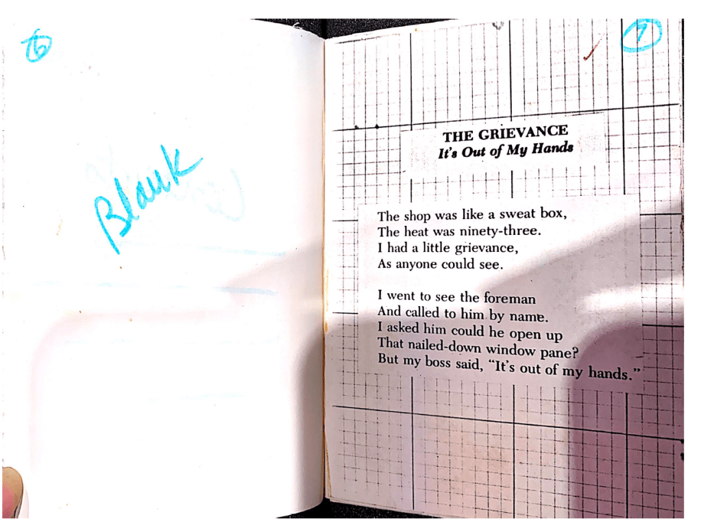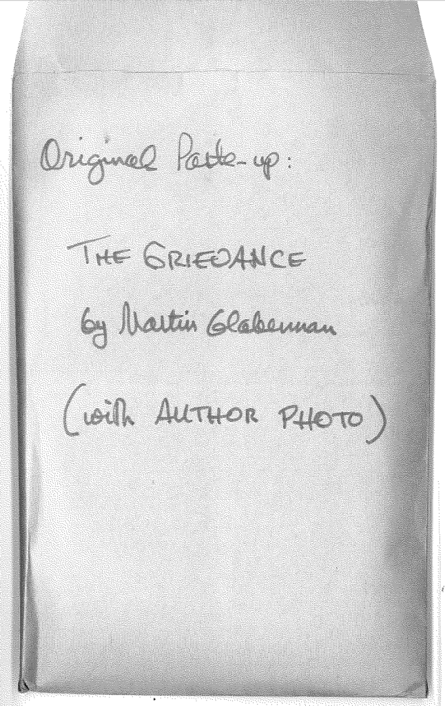 The Grievance was the first published collection of Glaberman’s poetry and the only chapbook of Stan Weir’s Singlejack Little Book series. In scanning the Weir archives deposited at Tamiment Library we were, unfortunately, unable to locate specifics of how Weir came to publish the collection on his Singlejack Press; the folders did not contain correspondence between Weir and Glaberman. However, with the generous help of one of Tamiment’s archivists, we were able to locate the original paste-up of the publication. (Location is TAM 279, Box 7).
