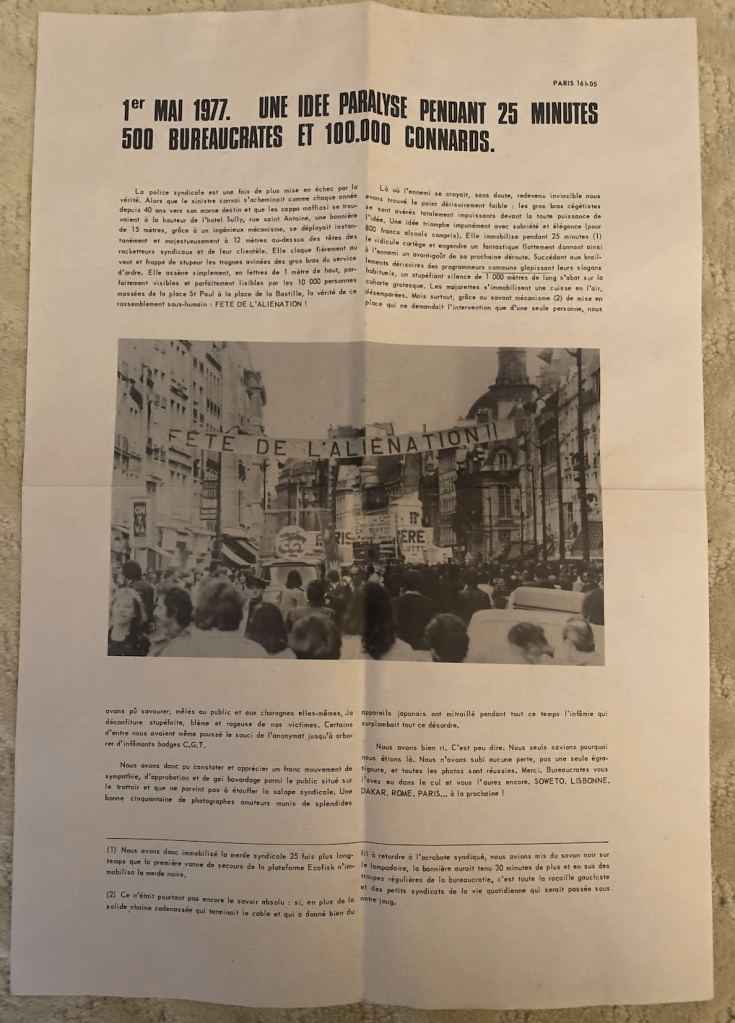 In a detailed and very informative interview with The Brilliant podcast, Isaac Cronin gave a great deal of detail into the context of the writing of the book, the process of it, and some of the movement and personal dynamics that are relevant to understanding how it came to be. For those who are interested that podcast can be found here. It is of note that Cronin claims there were “ten printings in five editions” in France, but we have only been able to locate two editions (three if one counts the initial paperback and hardcover printings; the third, from 1994, is not in our holdings). Cronin also states there was a Spanish translation of the book, but we haven’t been able to locate it (if anyone who has information about it please reach out!)